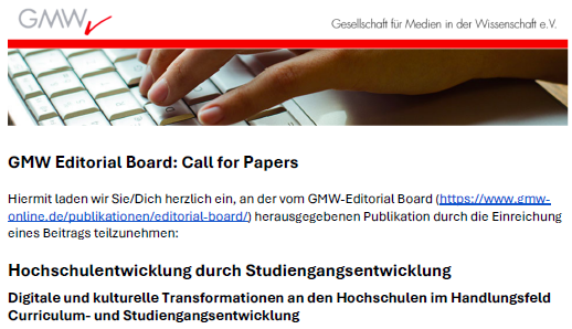 Das Editorial Board der Gesellschaft für Medien in der Wissenschaft (GMW) lädt zur Mitwirkung an einer Publikation zum Thema „Hochschulentwicklung durch Studiengangsentwicklung” ein. Gesucht werden Beiträge, die innovative Konzepte sichtbar machen, kritische Perspektiven eröffnen und Impulse für die Weiterentwicklung von Studiengängen geben. Abstracts können bis Ende November 2025 eingereicht werden.
