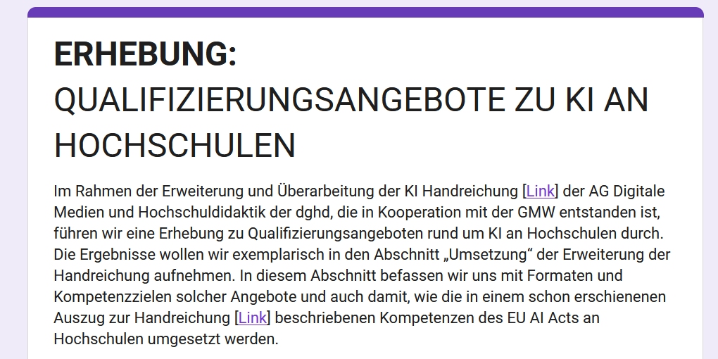 Im Rahmen einer Erweiterung und Überarbeitung der “Didaktischen Handreichung zur praktischen Nutzung von KI in der Lehre” der AG Digitale Medien und Hochschuldidaktik der dghd, die 2024/2025 in Kooperation mit der GMW entstanden ist, führen wir aktuell eine Erhebung zu Qualifizierungsangeboten rund um KI an Hochschulen durch.