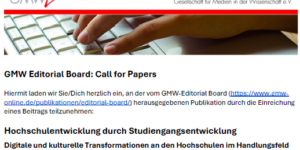 Das Editorial Board der Gesellschaft für Medien in der Wissenschaft (GMW) lädt zur Mitwirkung an einer Publikation zum Thema „Hochschulentwicklung durch Studiengangsentwicklung” ein. Gesucht werden Beiträge, die innovative Konzepte sichtbar …
